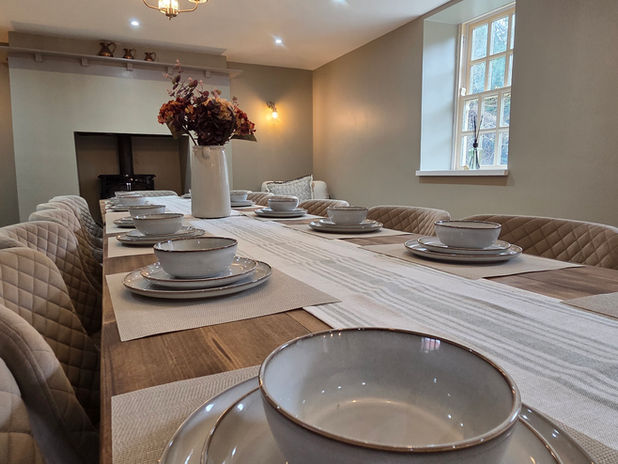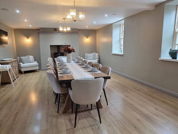 Welcome to the Farmhouse at TyneView Estate, a beautifully restored Grade II listed home blending historic character with modern comfort. As you arrive in the car park, you’ll enter through a secure coded gate and follow the path to the main porch—the oldest part of the property—where a spacious kitchen and large dining area await. This section of the farmhouse also hosts four bedrooms across two floors, including a generous attic room sleeping five, and three first-floor bedrooms sleeping seven more guests, complete with an ensuite and a family bathroom.